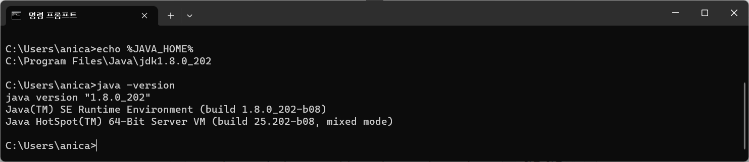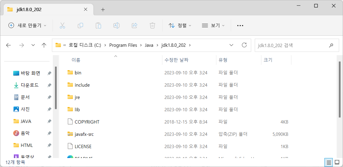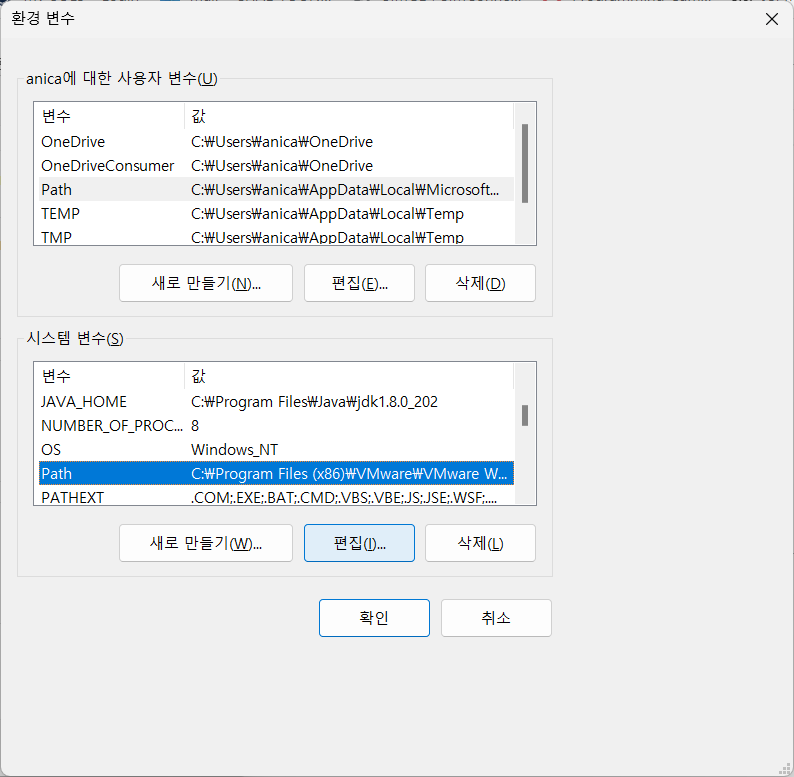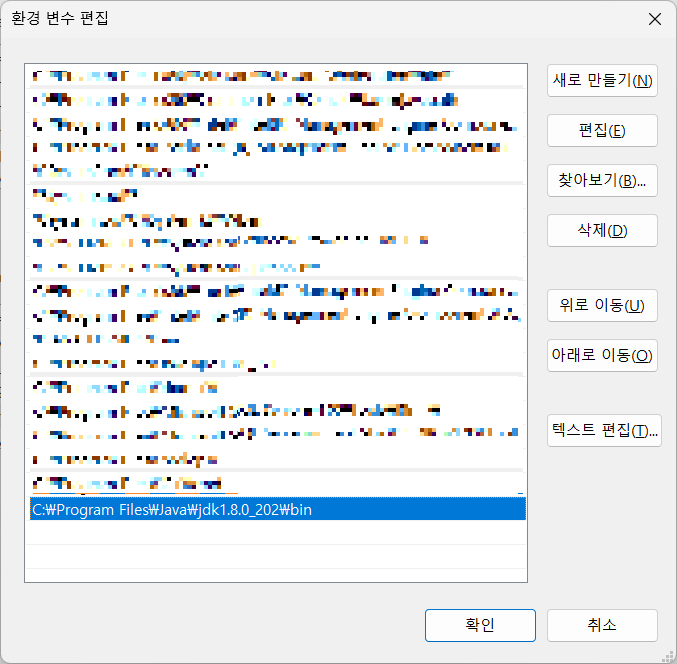 4. Path 변수 편집 > 새로 만들기 > JDK 설치 경로\bin (C:\Program Files\Java\jdk1.8.0_202\bin) > 확인