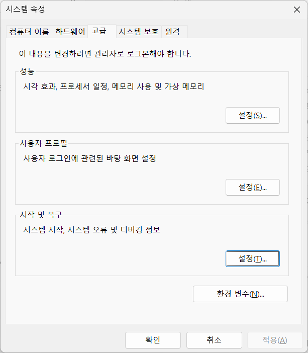 1. 설정 > 시스템 > 정보 > 고급 시스템 설정