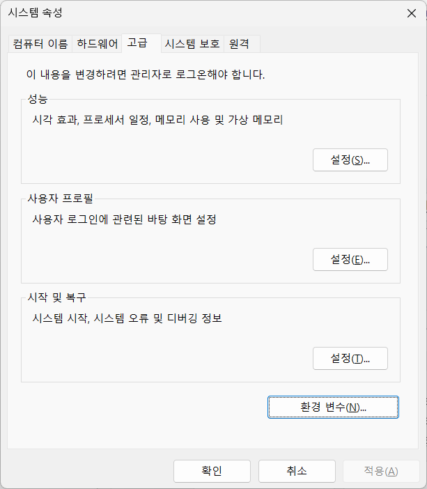 1. 설정 > 시스템 > 정보 > 고급 시스템 설정