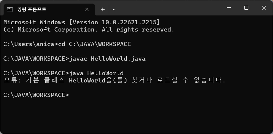 오류: 기본 클래스 HelloWorld을(를) 찾거나 로드할 수 없습니다.