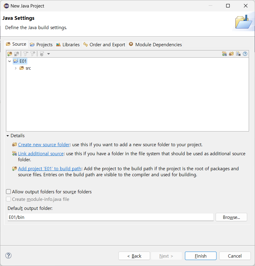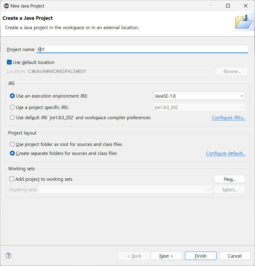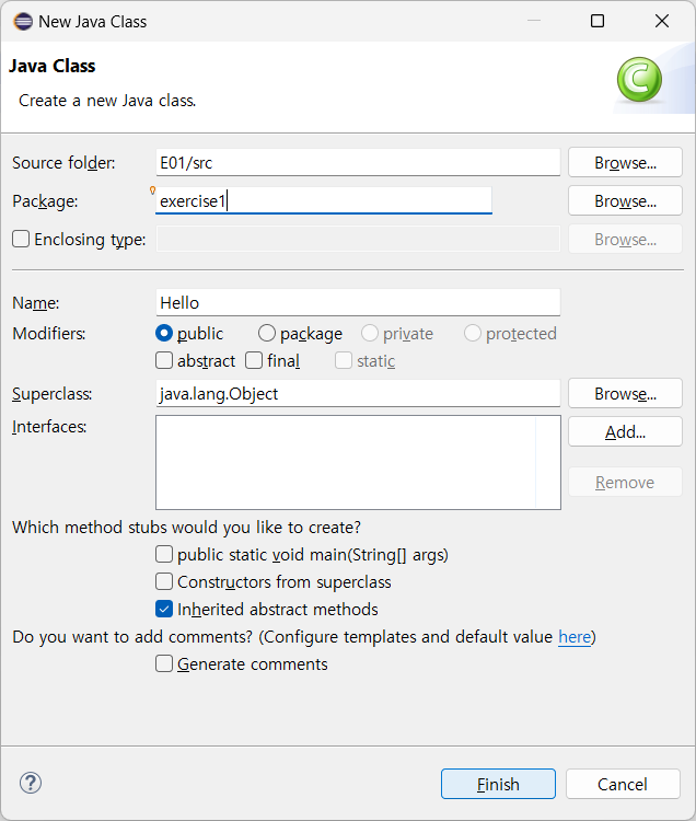 5. 원하는 이름으로 패키지 (package)랑 클래스 이름 입력 후 Finish 클릭