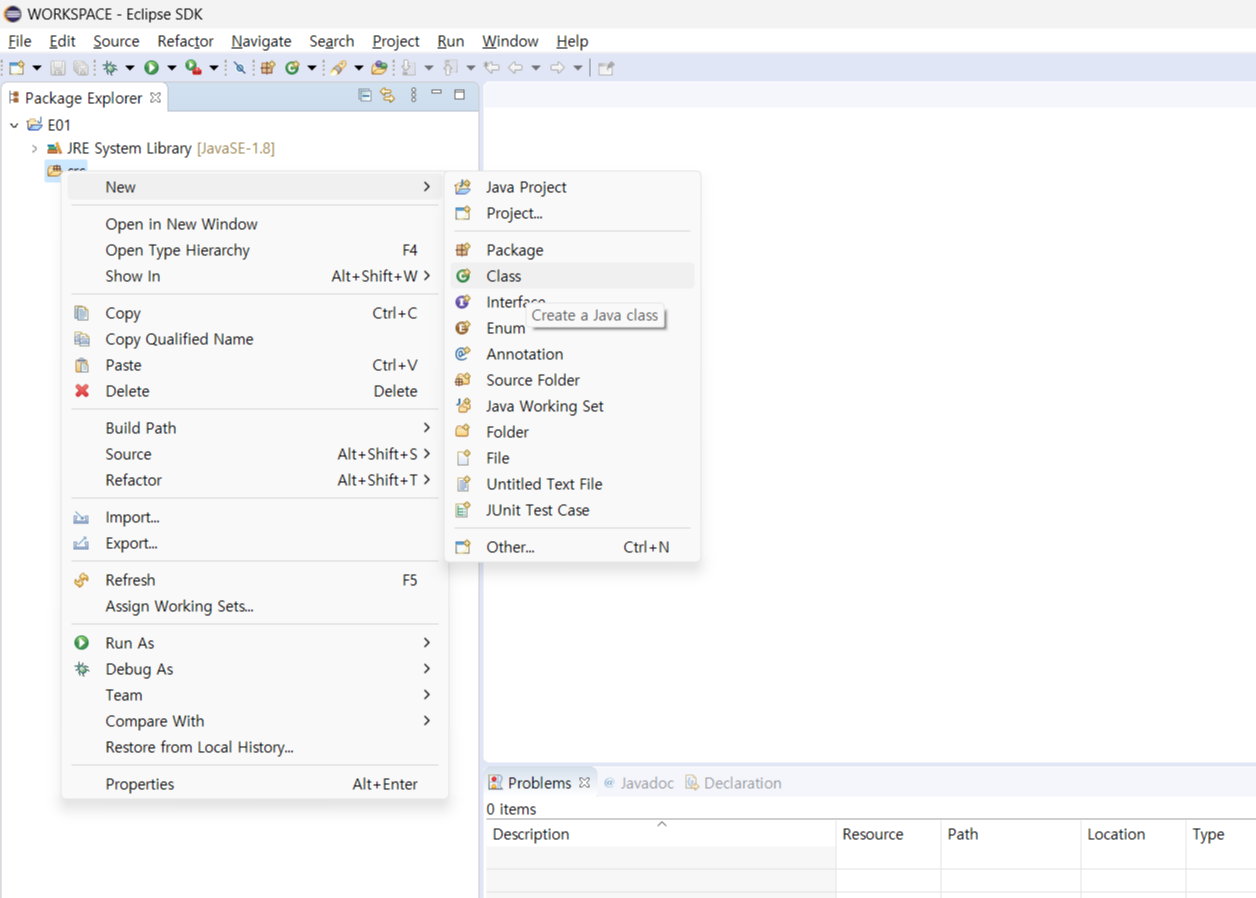 4. 오른 쪽 마우스 클릭 후 new > Class 클릭
