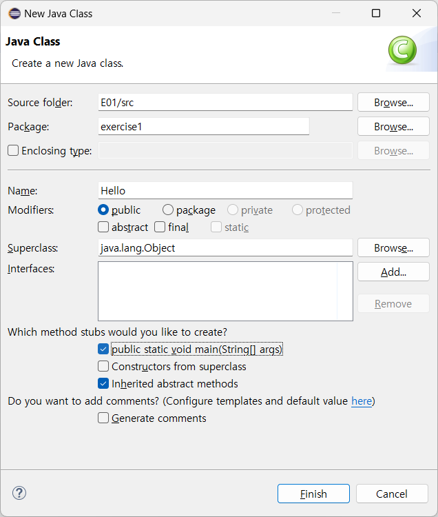 public static void main(String[] args) 체크: 자동으로 메인 메서드 생성